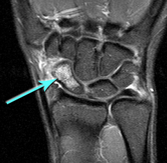 Unfortunately scaphoid fractures do not always show on an initial xray; they may not show up until the initial pain has settled down. The following patient's fracture did not show up on the original xrays taken in the A&E department. An MR scan shows the fracture clearly; the blue arrow points to the white area in the scaphoid that represents bruising in the bone. The subsequent xray confrims the presence of the fracture, albeit still very subtly (white arrows).
